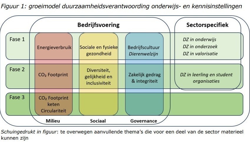 Dit groeimodel bevat de van belang zijnde duurzaamheidsonderwerpen en bijhorende indicatoren voor onderwijs- en kennisinstellingen. In hoofdstuk vier van de handreiking is dit model uitgewerkt inclusief de indicatoren die bij de onderwerpen zijn geselecteerd. In bijlage B van de handreiking is de selectie van de duurzaamheidsonderwerpen toegelicht.